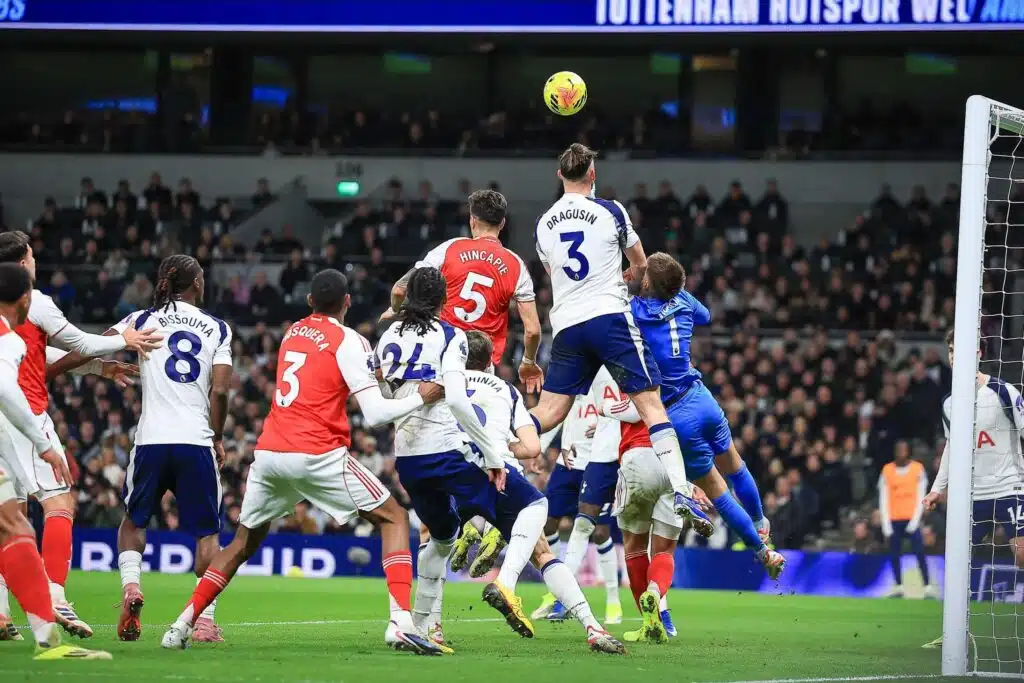Kokenut puolustaja korostaa kaksinkamppailuja isoja toppareita vastaan, kuten Gabriel Magalhães ja William Saliba, jotka vyöryvät kohti maalia.